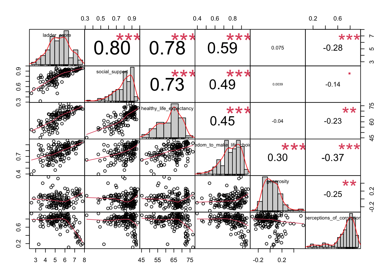 ggcorplotovercorplotis thatggcorplotcan give you p-values on the correlogram. Personally, I think the visual output ofchart.Correlationis a bit nicer.↩︎This does not tell us anything about happiness on the individual level. These data cannot be used to determine whether an individual’s social support is correlated to their happiness. These are ecologic measures and using them for individual-level inference might lead to ecologic fallacy↩︎