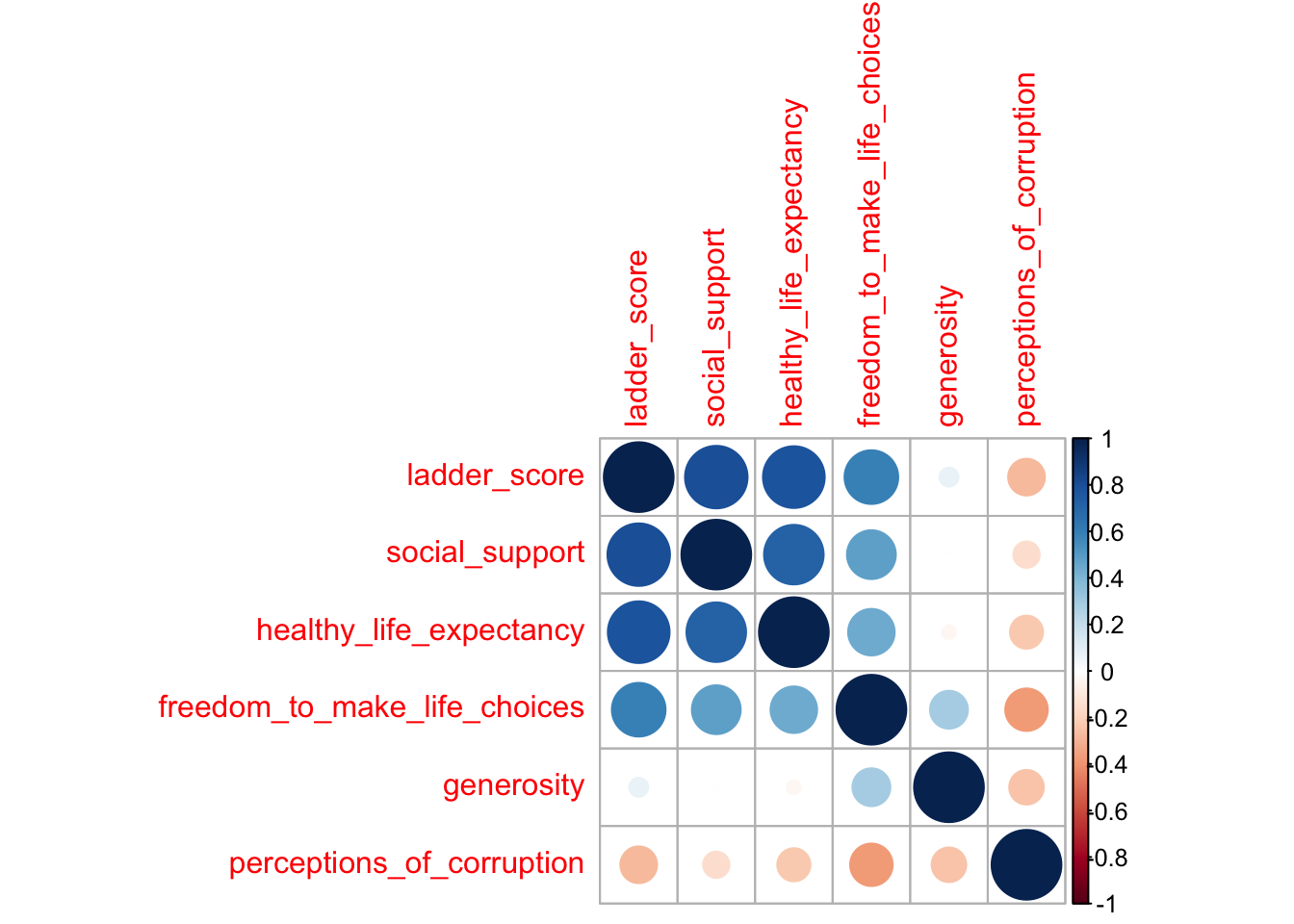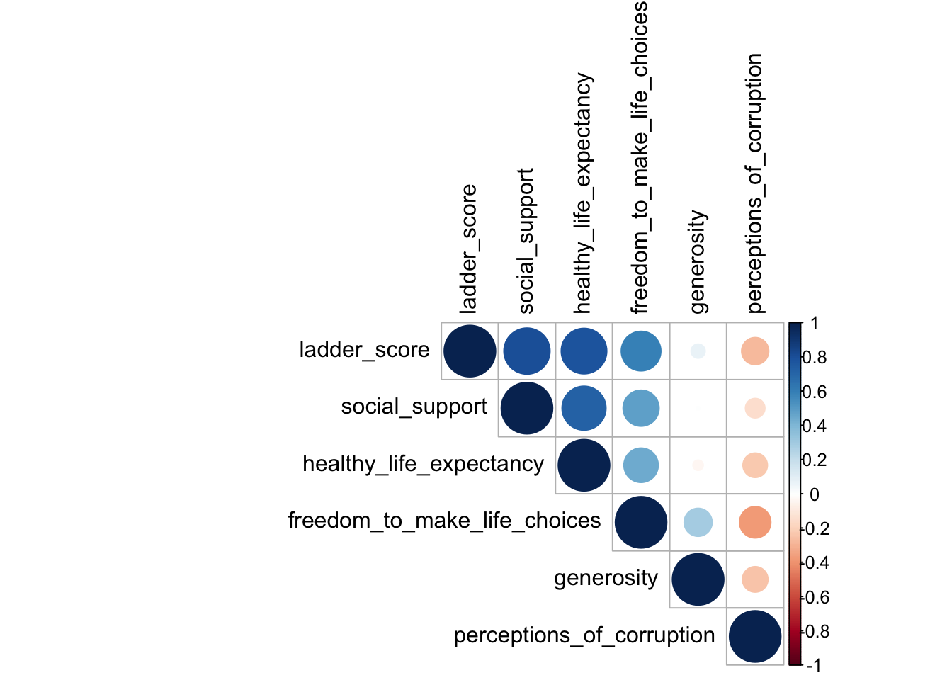 Big blue circles mean high correlation in the positive direction, and again, we see that social support and healthy life expectancy are most closely correlated with happiness. This corplot isn’t bad, but let’s eliminate the mirror image along the diagonal and change the label colors since red labels freak me out: