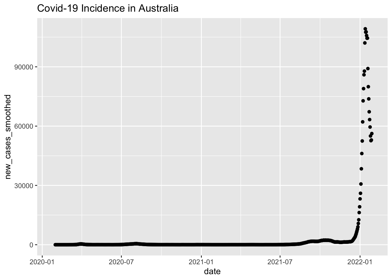 Speaking of Epi curves, it’s very easy to make one of your own - certainly easier than sourdough starter. Here’s one using ggplot2 and the Covid-19 global dataset maintained by Our World in Data, OWID. OWID compiles this dataset from several sources including the Center for Systems Science and Engineering (CSSE) at Johns Hopkins University, national government reports, and the Human Mortality Database (2021).
