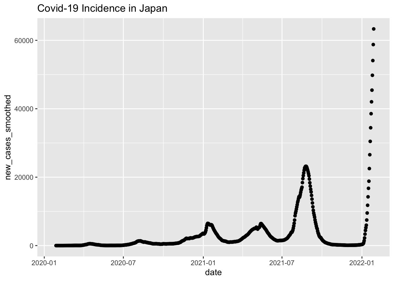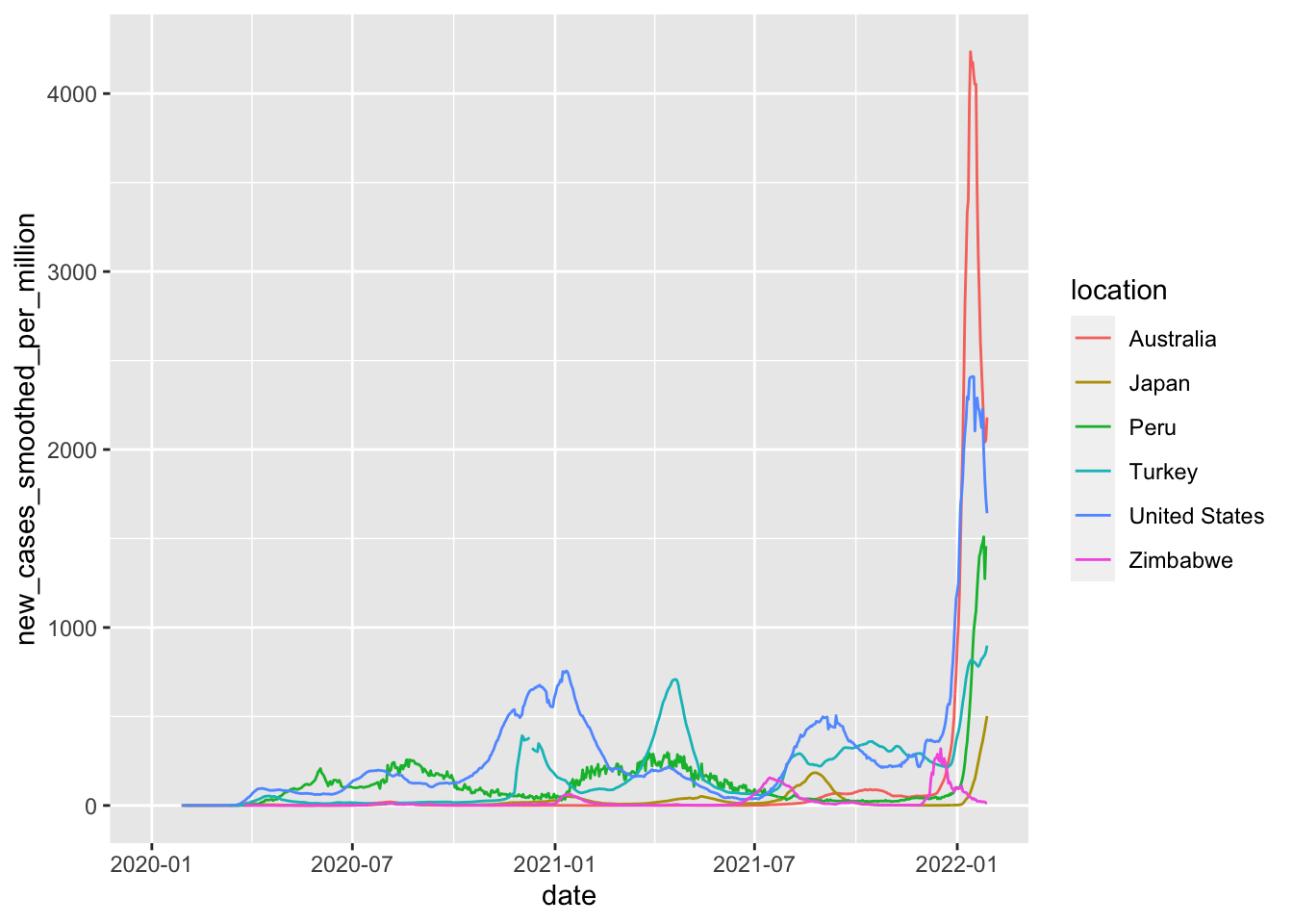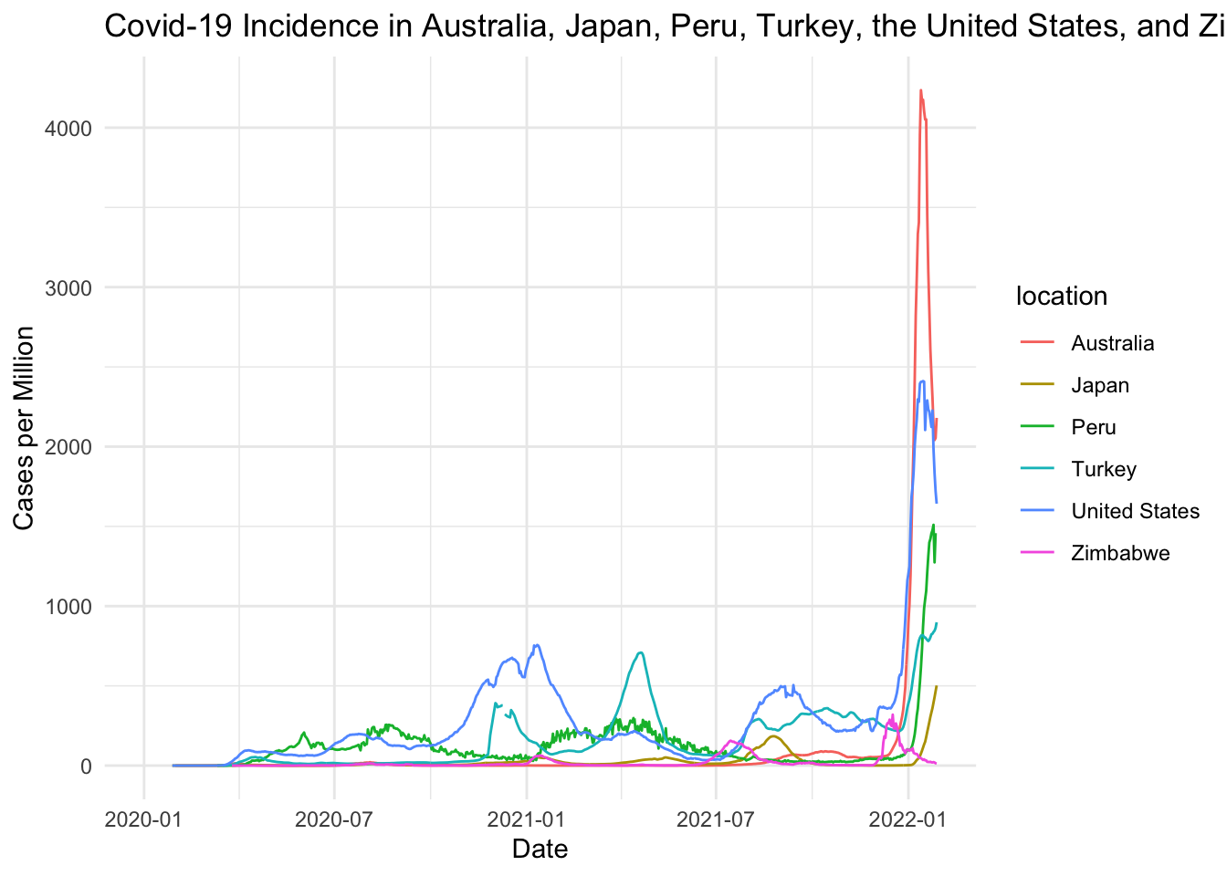 labs(title = "Covid-19 Incidence in Australia, Japan, Peru, Turkey, the United States, and Zimbabwe, Cases per Million, Smoothed 7-Day Average",