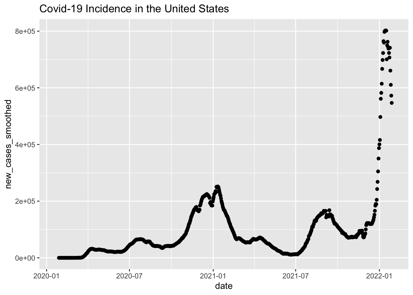 It looks a little crazy, almost like there are several superimposed curves. What’s really happening is that we’re seeing a lot of noise from day-to-day fluctuation. Data aren’t reported uniformly, so it’s not uncommon to observe a “spike” in reports on, say, Mondays when reporting for the weekend is done.