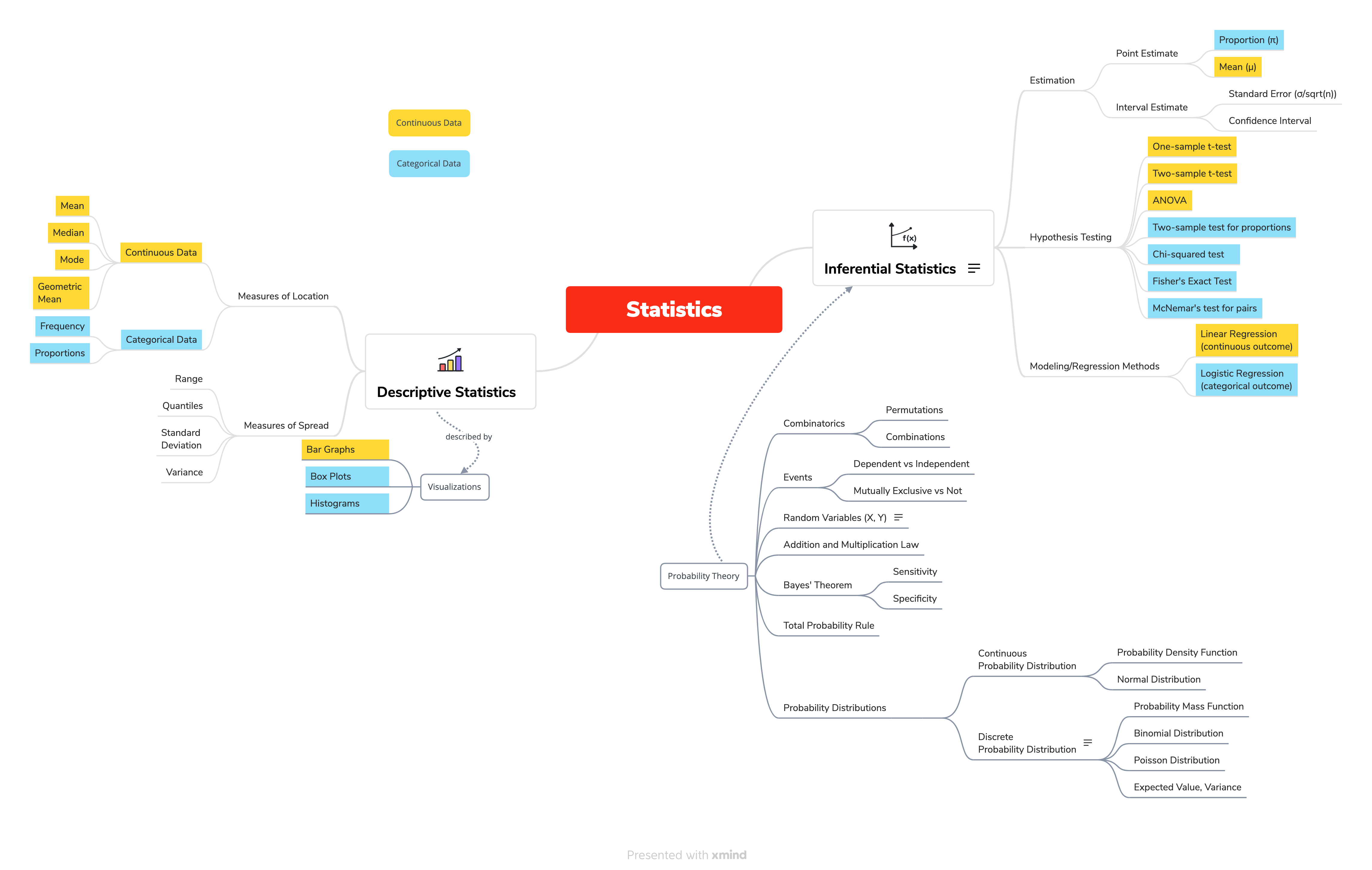With that in mind, I endeavored to do a quick review of my statistics coursework - I enjoyed stats classes very much - and I figured the best way to do that would be to jot out a concept map. This ended up taking quite a bit longer than I thought - it’s unsettling how much I forgot in 2.5 years. Nevertheless, it provided a very useful memory re-fresh, and gave a bit more resolution to that map floating in my mind.