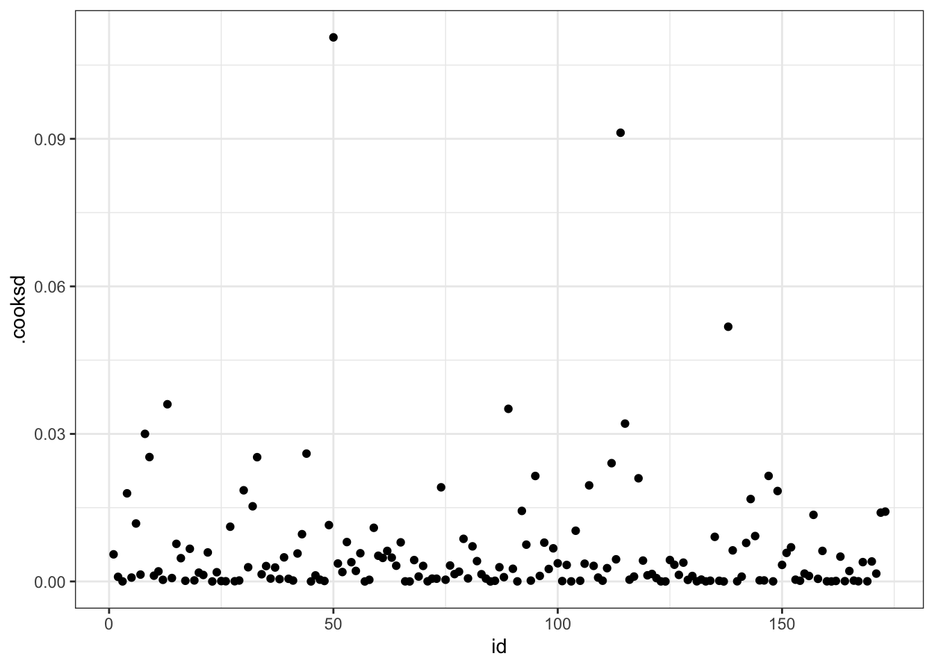 In truth, the study of outliers and influential observation is a whole thing and worthy of its own project. For now, let’s do two things. First, let’s look at Figure 2 and acknowledge that there’s not much visual evidence of outliers. Second, let’s do a quick check using Cook’s distance, .cooksd in our augment() dataframe.
